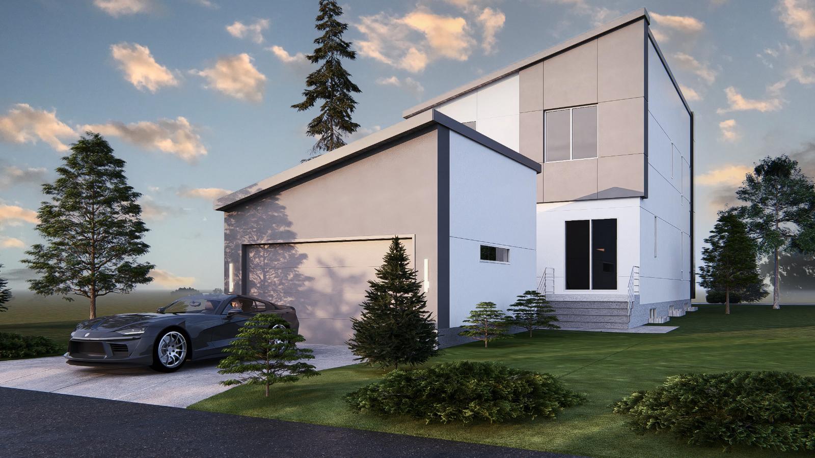 The front elevation is designed to feel sharp and modern while still maintaining warmth through wood accents, stone detailing, and soft exterior lighting. Large windows will allow natural light to fill the main living spaces, while the strong exterior forms give the home a distinctive presence from the street.